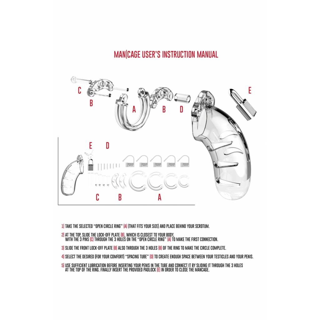 Accessoire de contrainte par excellence, la cage peut se verrouiller à l'aide d'un cadenas en métal (1 fourni) ou d'un cadenas en plastique jetable (5 fournis). L'utilisation de cadenas en plastique vous garantit de ne pas déclencher l'alarme des détecteurs de métaux lorsque vous passez sous un portique de sécurité dans un aéroport par exemple.