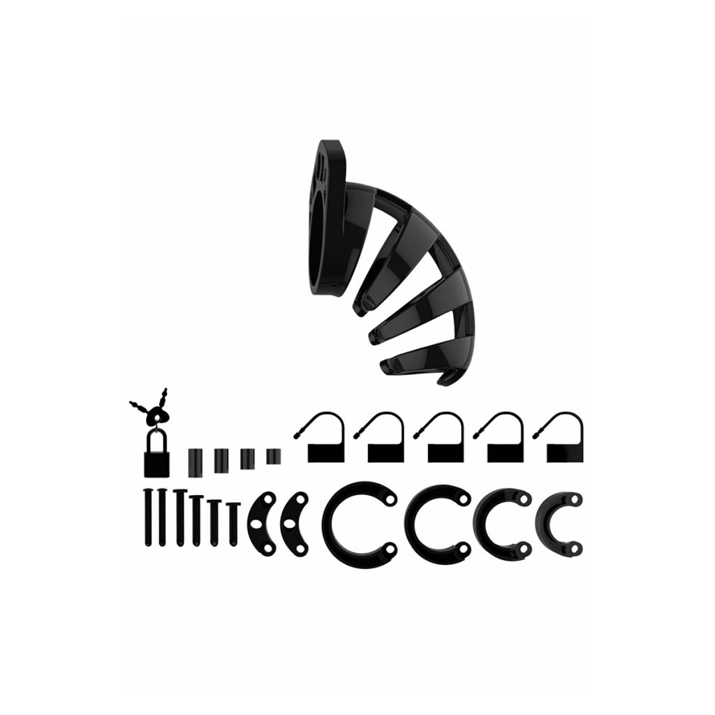 Accessoire de contrainte par excellence, la cage peut se verrouiller à l'aide d'un cadenas en métal (1 fourni) ou d'un cadenas en plastique jetable (5 fournis). L'utilisation de cadenas en plastique vous garantit de ne pas déclencher l'alarme des détecteurs de métaux lorsque vous passez sous un portique de sécurité dans un aéroport par exemple.