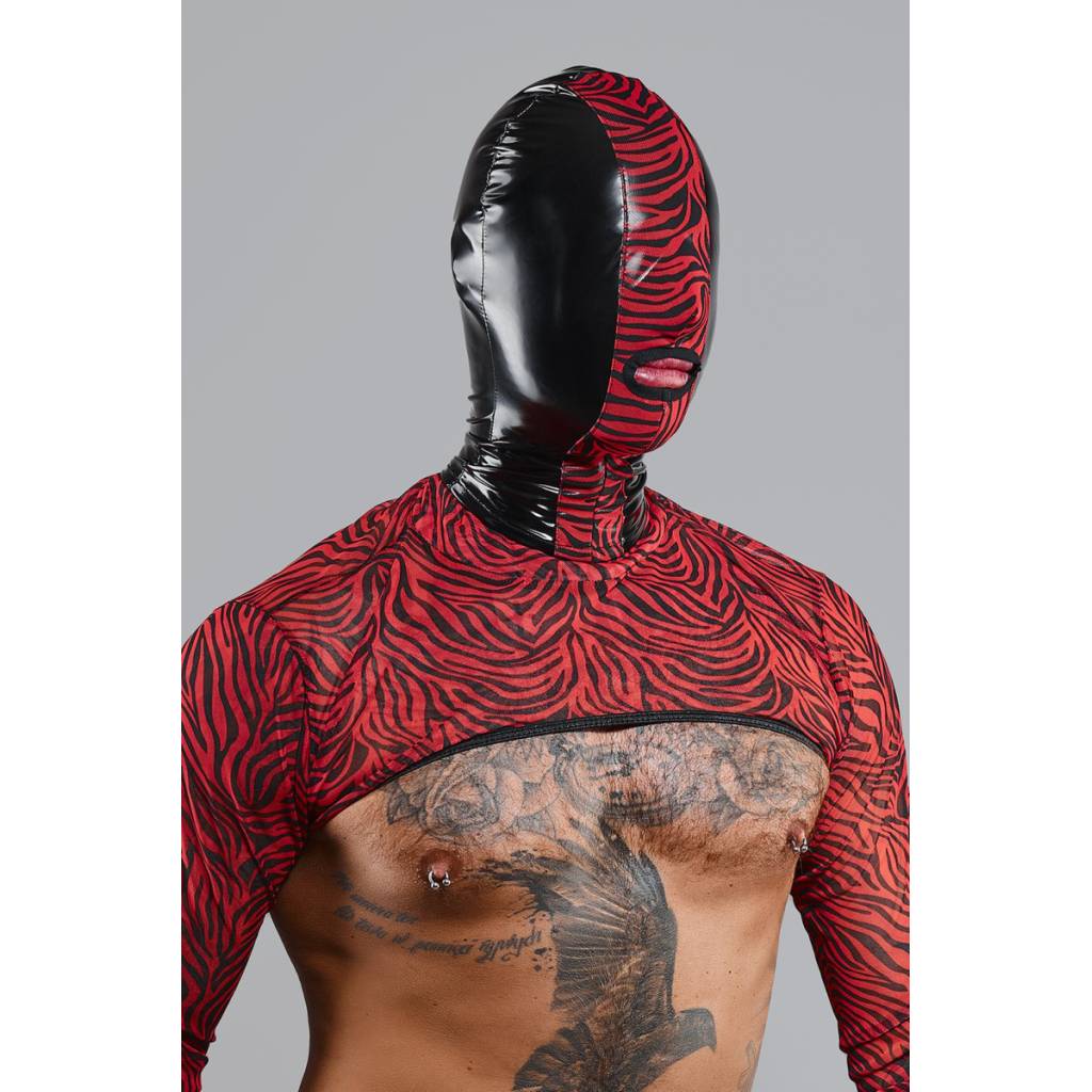 Cagoule fabriquée en vinyle souple et brillant par la marque Regnes Fetish Lingerie en Europe. A lavant, cette cagoule est doublée de tulle zébré noir et rouge pour apporter un effet plus animal.