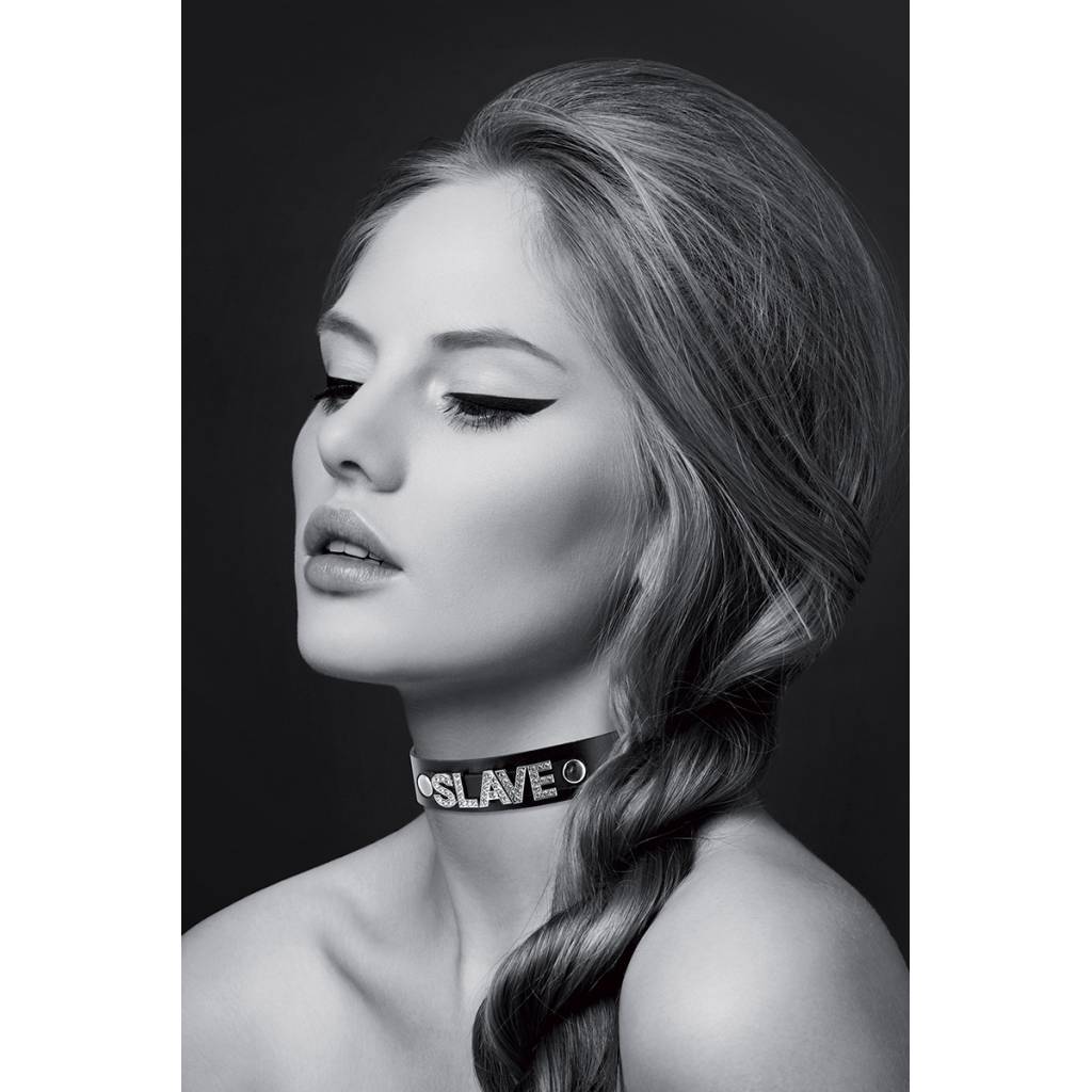 Avec le mot "SLAVE" en bijou strass en relief sur le devant, ce collier noir, ras de cou, de la marque Bijoux pour toi, affichera clairement votre côté soumise et coquine.