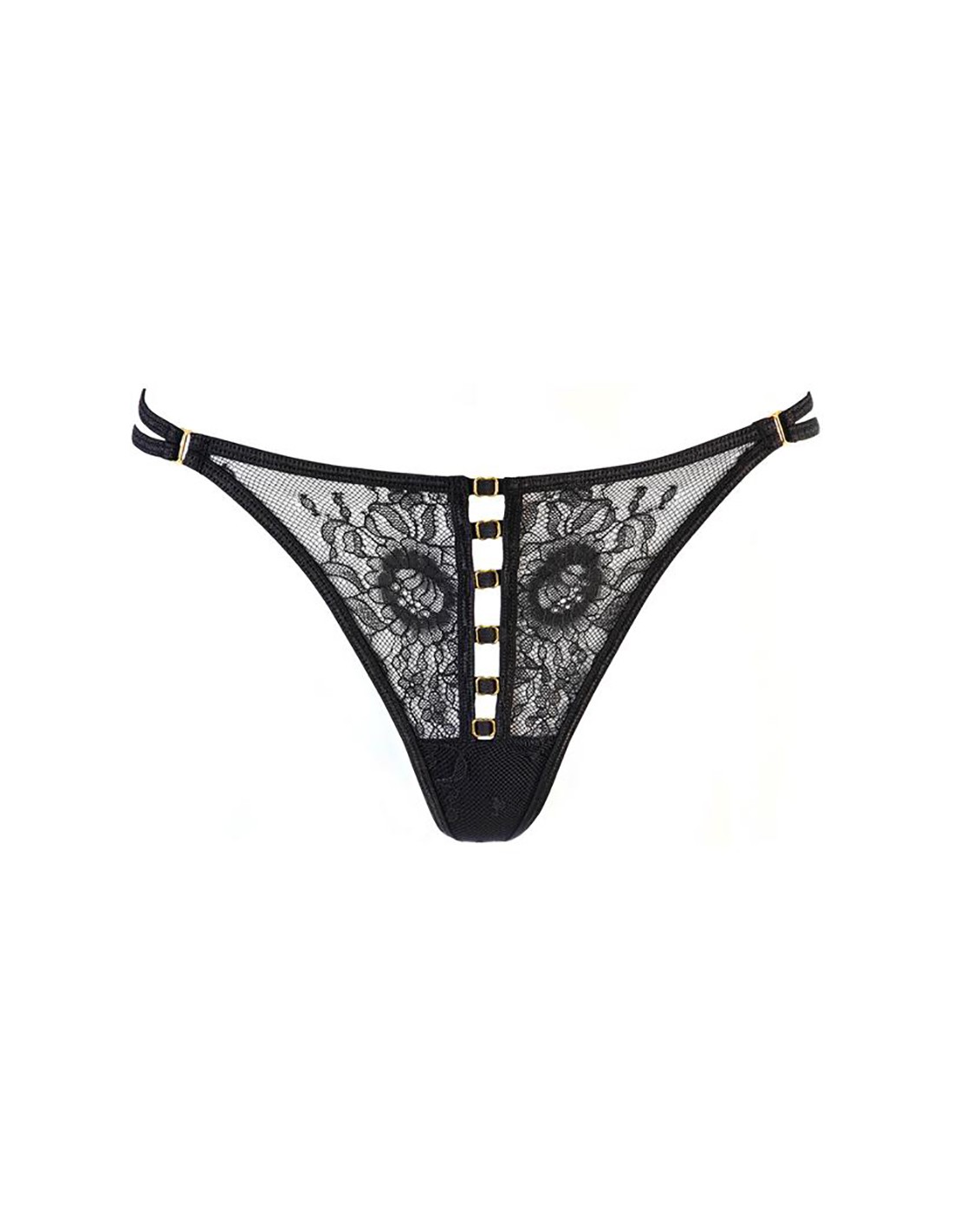 A l'avant la dentelle délicate est dotée d'une ouverture verticale maintenue par des petites bandes élastiques décorée d'un petit bijou dorée semblable à un passant de bretelle.