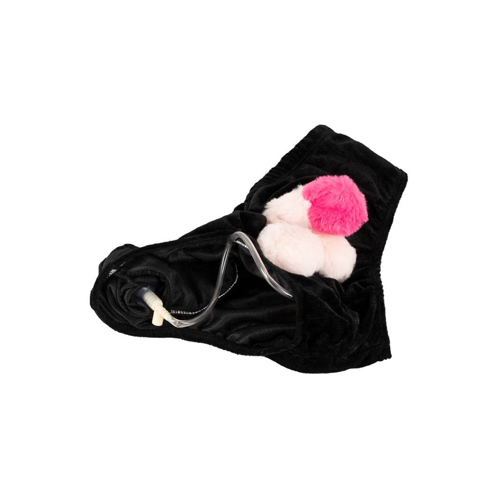 Ce slip noir unisexe cache une surprise hilarante : une peluche blanche et rose en forme de pénis qui peut se redresser en un clin d’œil grâce à un système pneumatique discret.
