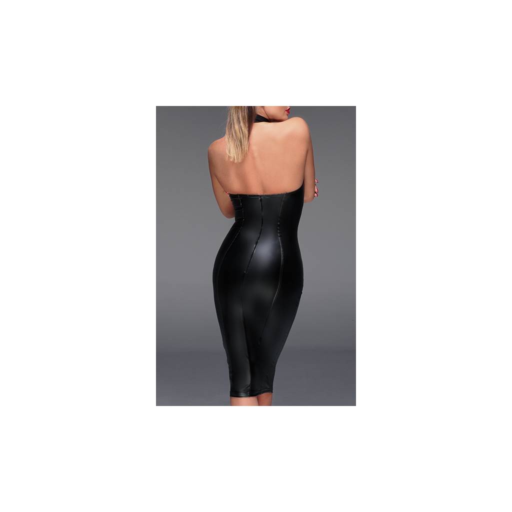 Dos nu, la robe possède un col collier formé de deux bandes larges élastiques duquel pend un large anneau chromé, qui pourra être purement décoratif ou recevra une laisse pour des jeux de rôle plus fetish.