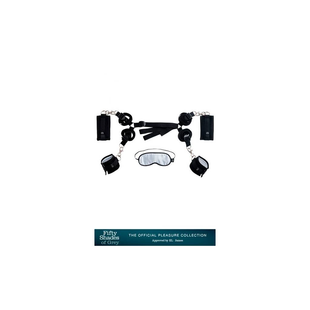 Un coffret ambiance BDSM avec tout le nécessaire pour attacher votre partenaire sur le lit, par Fifty Shades of Grey, la collection officielle du plaisir.