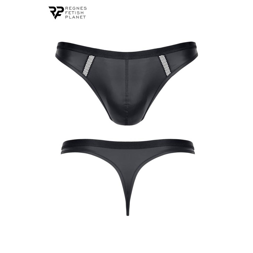 String noir de la marque Regnes Fetish Planet, fabriqué avec du tissu brillant effet wetlook noir. Il dispose dune large ceinture extensible au niveau de la taille. La coquille permet de bien cacher et de mettre en avant vos attributs virils de mâle. De plus de chaque côté, les petites bandes en résille vous donnent un côté encore plus sexy et envoûtant.