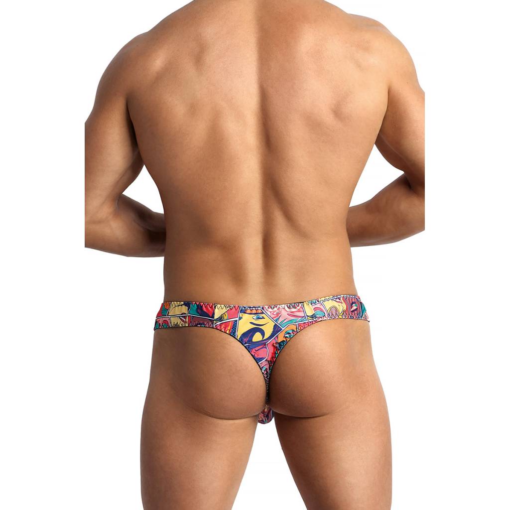 Ce string sexy est fabriqué en tissu imprimé de visages inspirés des comics et du pop art.