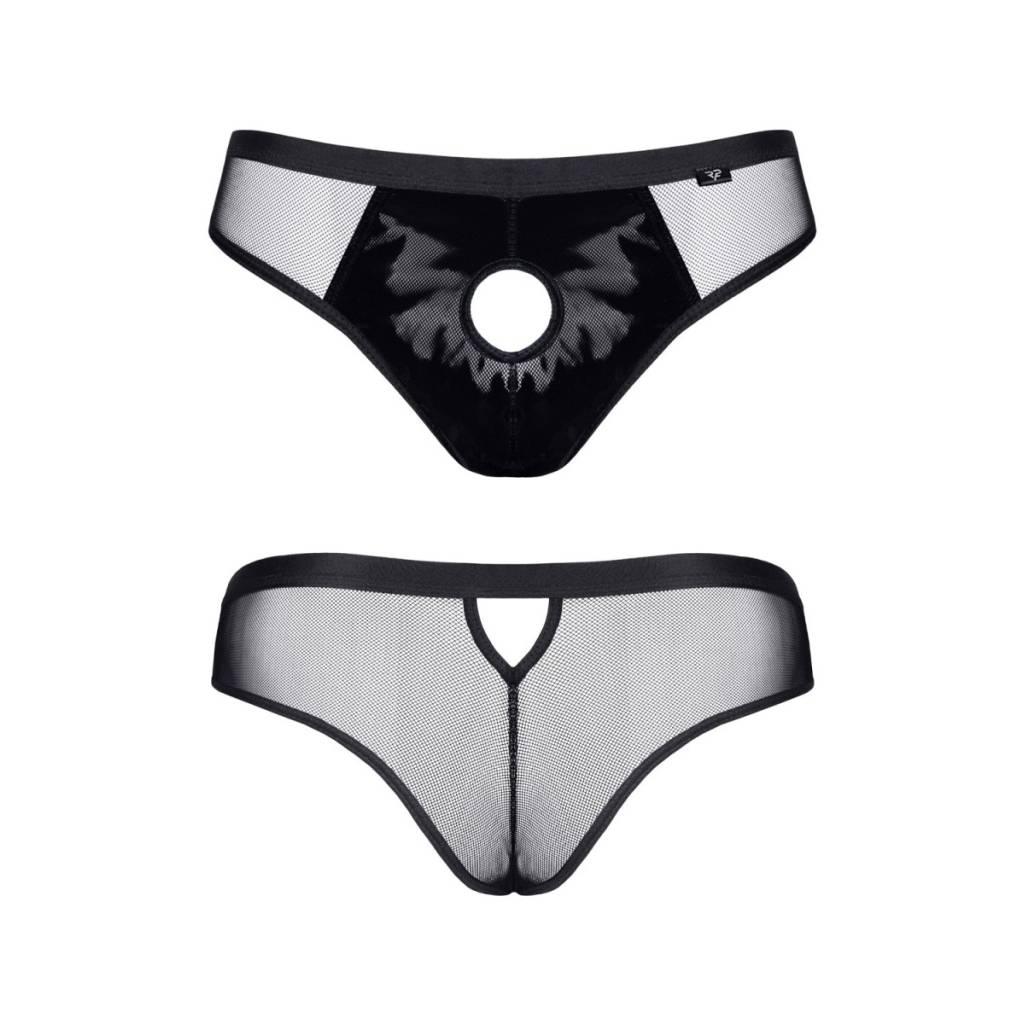 La marque Regnes Fetish Fashion vous propose de découvrir ce slip type brésilien fabriqué en tulle noir extensible qui joue avec la transparence. Au niveau du sexe il est doublé dun vinyle noir brillant pour attirer loeil sans tout montrer. Ce slip sexy est maintenu fermement en place par une bande élastique large qui fait office de ceinture.